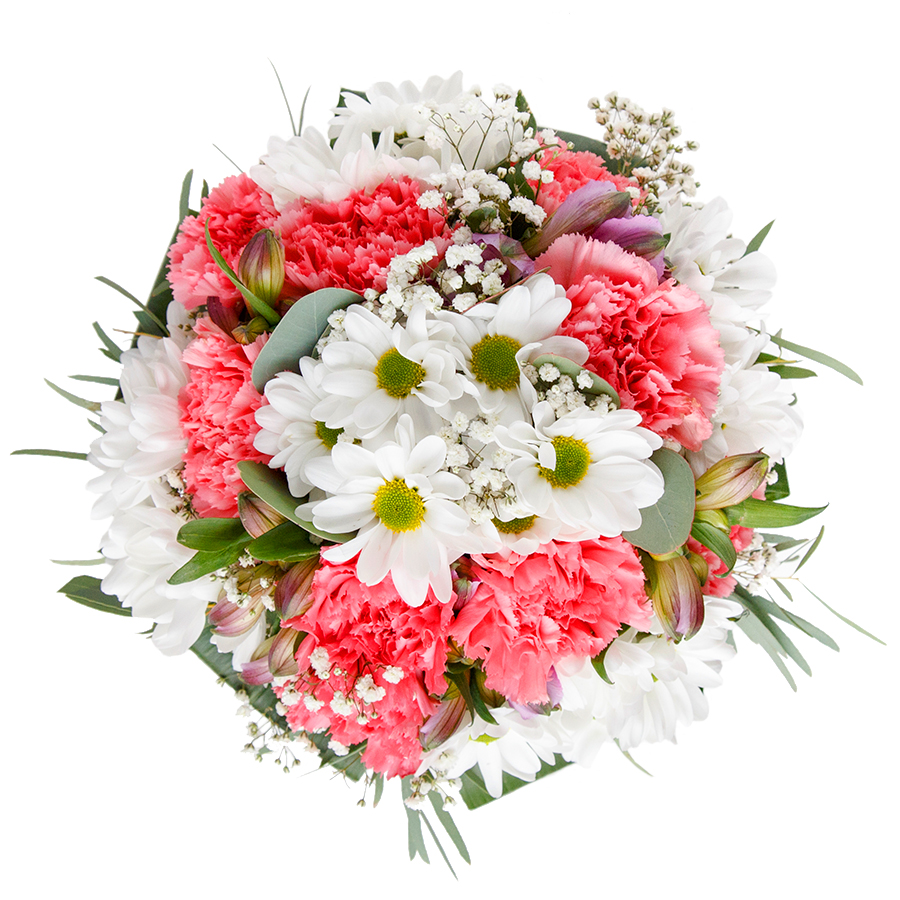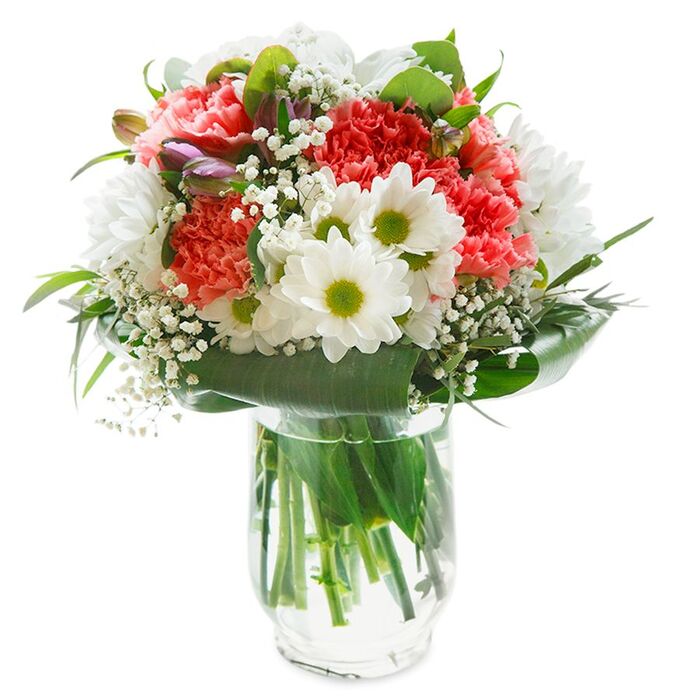 Celebrate special moments with our elegant seasonal floral arrangement. This exceptional bouquet combines pristine snow-white chrysanthemums, delicate gypsophila, and lovely light pink carnations, beautifully arranged with aspidistra leaves for a graceful presentation.